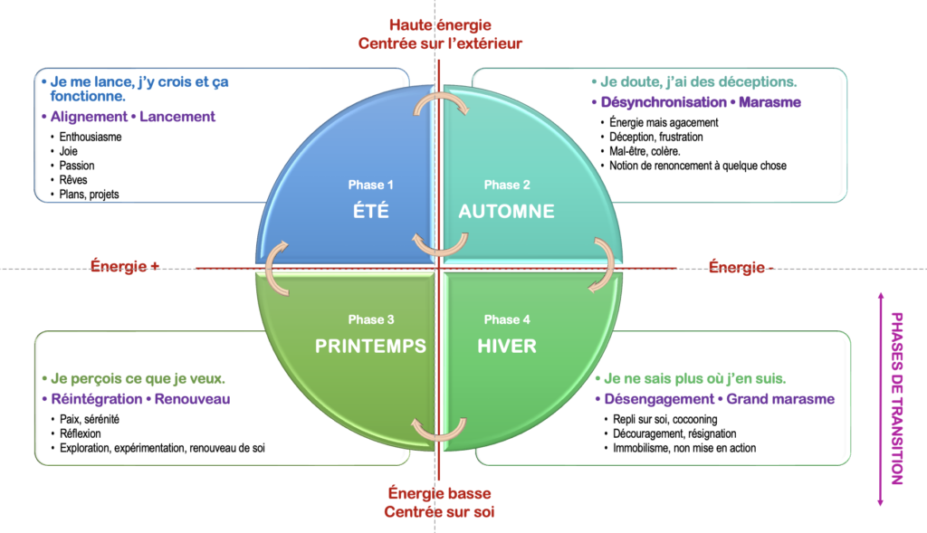- phase 4 : Énergie basse et positive, confiance retrouvée, sérénité